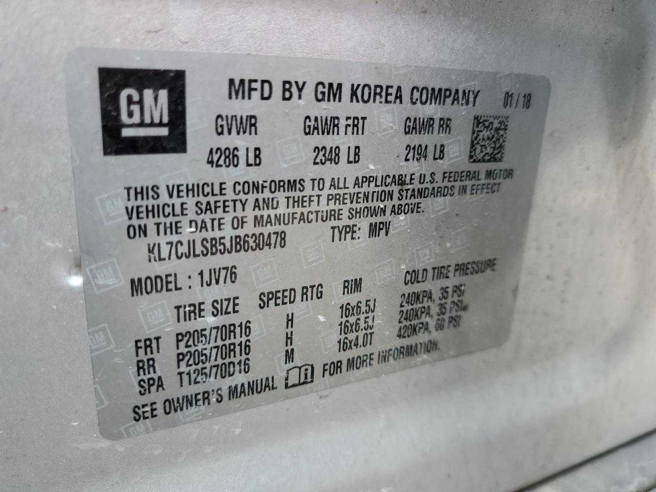 Samochód wyposażony w silnik 4-cylindrowy o pojemności 1.4 litra. Skrzynia biegów - automatic. Rodzaj paliwa tego modelu - benzyna. Według fotorelacji z aukcji Copart przebieg wynosi 121 942 km. Numer VIN ciała - KL7CJLSB5JB630478.