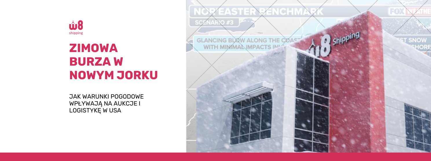 W tej sytuacji magazyn W8 Shipping w Nowym Jorku również działa z tymczasowymi ograniczeniami związanymi z warunkami pogodowymi i przeciążeniem terenu. Część portów w regionie została zamknięta lub nie działa na pełnych obrotach, co ma bezpośredni wpływ na terminy załadunku kontenerów i wysyłek. W związku z tym w przypadku samochodów zakupionych po 26.01.2026 r. koszty przechowywania (storage) tymczasowo przechodzą na klienta do czasu ustabilizowania się sytuacji. Samochody ze statusem Title Pending w Nowym Jorku są tymczasowo nie przyjmowane.
